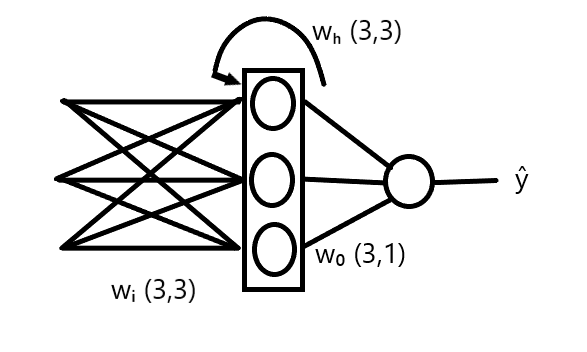 Wₒ (Hidden-to-Output): Weights connecting the final hidden state to the output node. Shape: (3, 1).