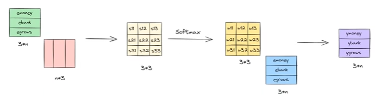 Here, we take the dot product of the bank embedding with every word embedding in the sentence. These dot products produce scalar values (say s₂₁, s₂₂, s₂₃). Since raw dot products can have arbitrary magnitudes (for example, 36, −15, 32), we normalize them using the softmax function.
